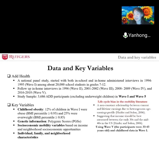 2022年4月28日上午,美国罗格斯大学农业、食品和资源经济系金艳红教授做题为“代际流动性与儿童肥胖:来自基因的证据”的学术报告。报告由探花 院长周月书教授主持,探花 、经济管理学院和食品科技学院等单位近200名师生参加。
