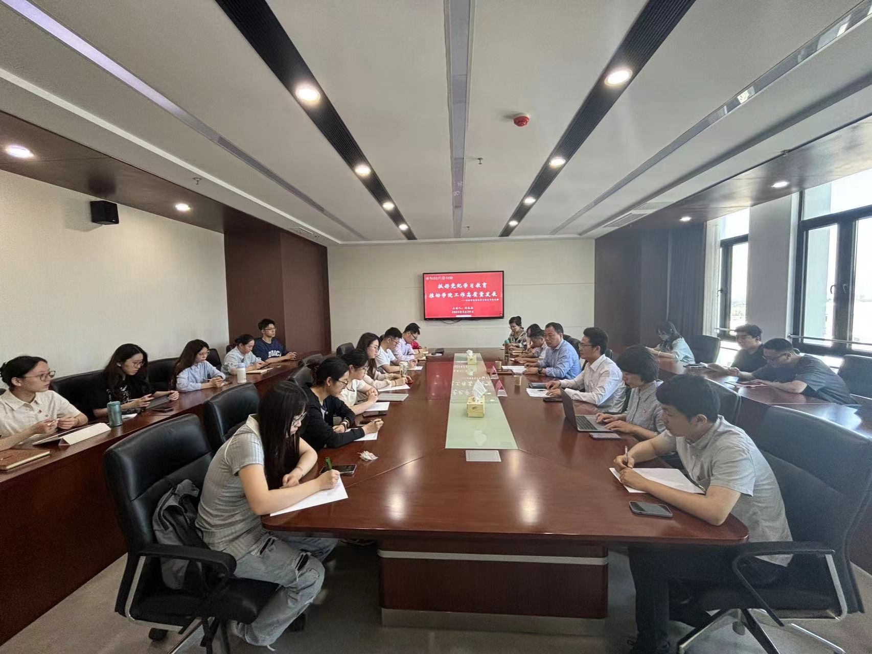 5月29日上午,探花 党委在第三实验楼1202会议室开展《抓好党纪学习教育,推动学院工作高质量发展》主题教育专题党课。本次党课由学院党委书记刘兆磊主讲,党委副书记朱珠主持,学院全体党支部书记和支委参加。