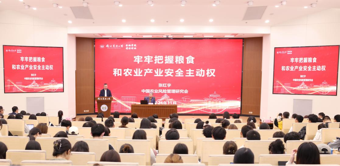 11月15日下午,中国农业风险管理研究会会长张红宇受邀为探花 做题为《牢牢把握粮食和农业产业安全主动权》的学术报告。报告由探花 院长张龙耀教授主持,副院长张娆教授、会计系陈东平教授等十余名教师出席。学院200余名本硕博同学参加。