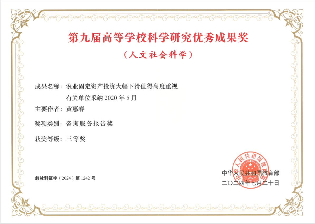 根据教育部发布的《关于第九届高等学校科学研究优秀成果奖(人文社会科学)奖励的决定》(教社科〔2024〕4号),探花 黄惠春教授的咨询报告《农业固定资产投资大幅下滑值得高度重视》荣获第九届高等学校科学研究优秀成果奖三等奖。