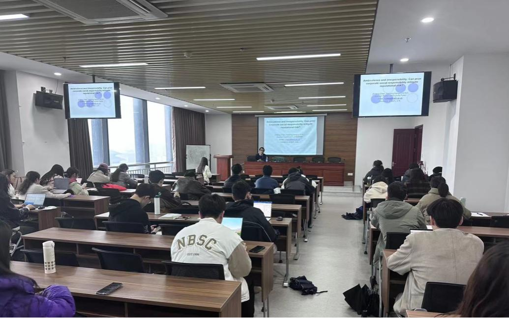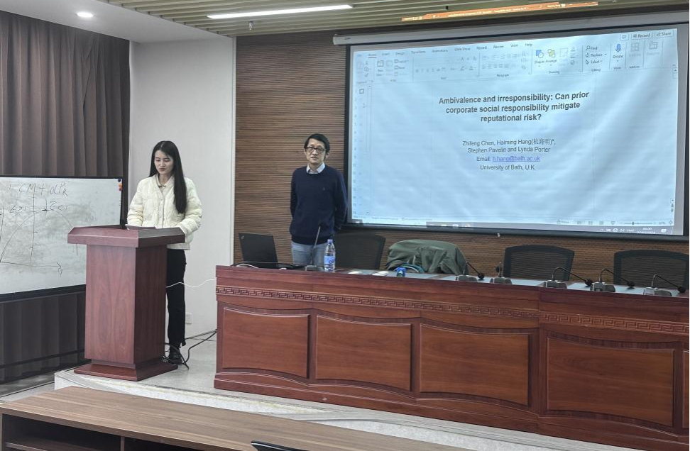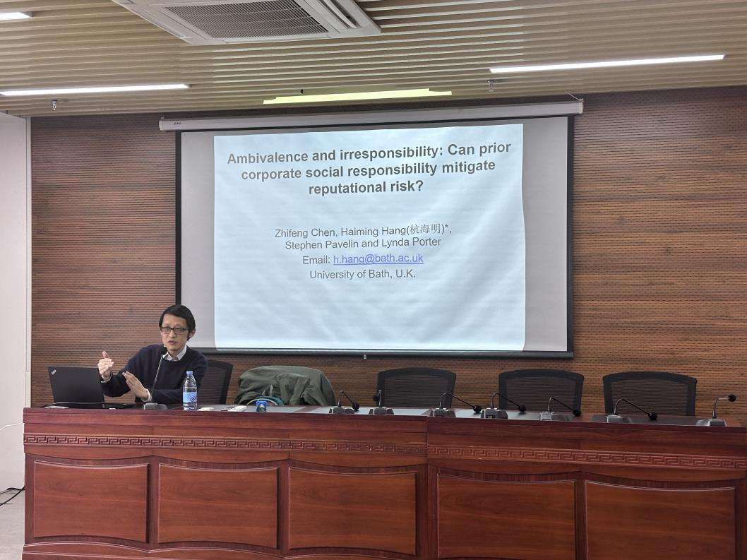 3月27日下午,英国巴斯大学市场营销系杭海明教授受邀为探花 做题为《Ambivalence and irresponsibility : Implications for the insurance value of a reputation for corporate social responsibility》的学术报告。报告由探花 吴雅倩老师主持,学院近百名师生参加。