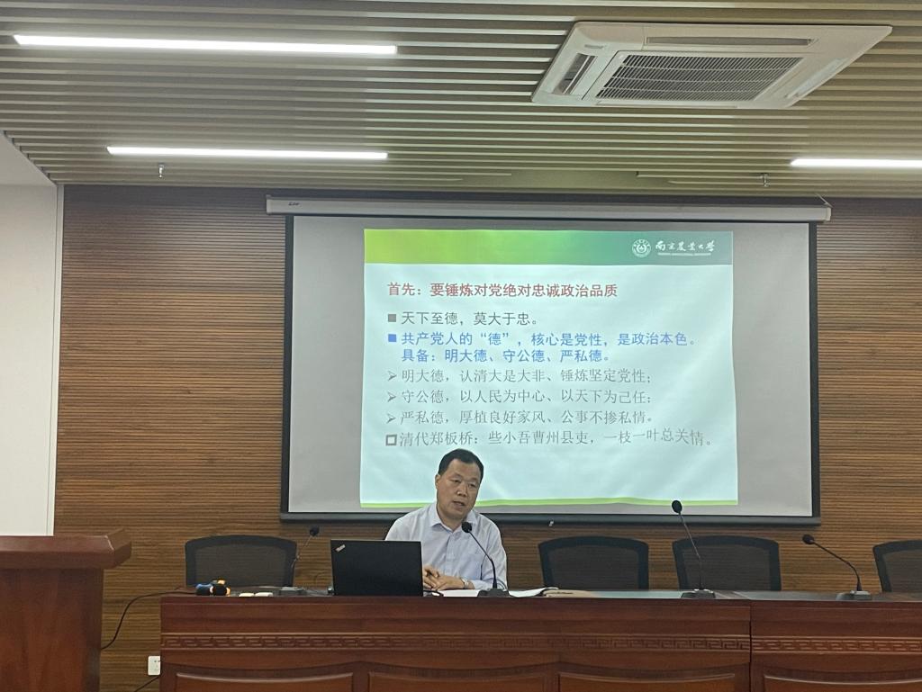 针对如何加强党性修养,刘兆磊围绕“坚定理想信念、弘扬优良传统、牢记初心使命、培育时代新人”四个方面,结合中国共产党史实、习近平总书记重要讲话、具体案例、校史院情进行了全面深入的讲解。他希望同学们继承爱国情怀,用习近平新时代中国特色社会主义思想凝心铸魂,全面贯彻党的二十大精神,深刻领悟“两个确立”的决定性意义,增强“四个意识”、坚定“四个自信”、做到“两个维护”,切实提升党性修养,锤炼个人品格,自觉做中国特色社会主义的坚定信仰者和忠实实践者。
